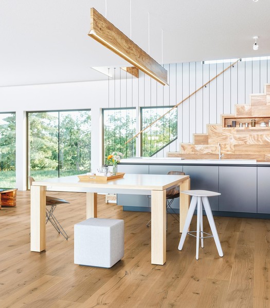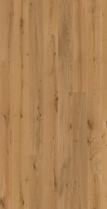 Dubová třívrstvá podlaha v širokém formátu prken 240,290 mm a délce prken 2130, 2450 mm v sukatém třídění. Prkna jsou zvýrazněna pískovaným kartáčovaným povrchem a opatřena fází na všech stranách. Povrch podlahy je chráněn extrémně matným UV olejem.. Tento druh podlahy je vhodný na podlahové topení. Možnost instalace plovoucím způsobem nebo celoplošným lepením.